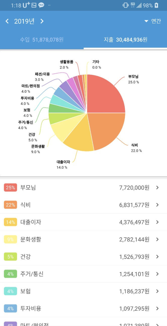 가장 많이 쓴 돈은 25%를 차지하는 부모님 용돈입니다. 770만원 정도가 되네요.