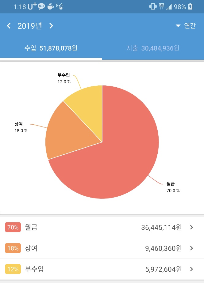 2018년에 한참 야근하고 출장 다닐 때에는 훨씬 수입이 높았는데, 올해는 회사의 사내벤처 프로젝트로 일하게 되면서 야근과 출장이 전혀 없었기 때문에 수입이 확 줄었습니다 ㅠㅠ