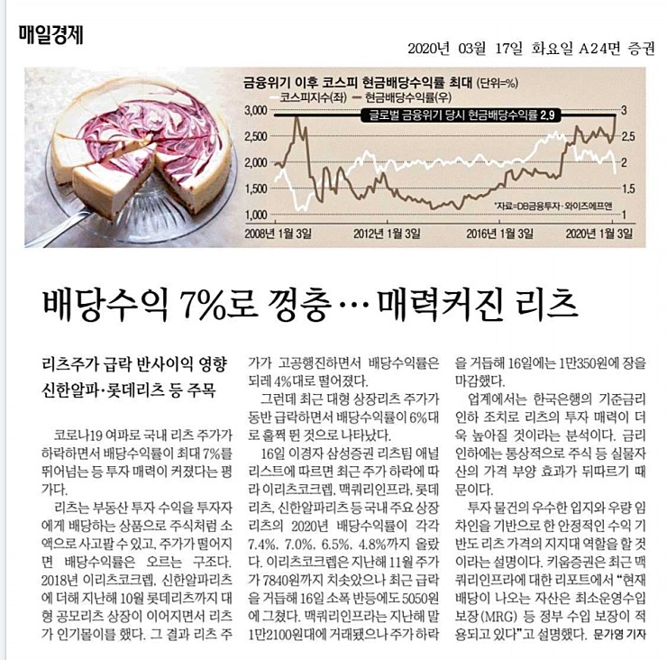 오늘 매일경제 자 리츠 관련 기사입니다. 금융위기 이후 배당수익률 최대입니다.