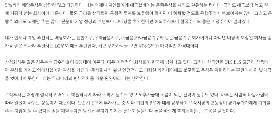 KT&G 같은 경우에는 전 차라리 미국의 알트리아나 MO를 더 선호하는 편이지만, 금융 지주 회사들이나 배당이 어느정도 보장된 회사들을 사라고 하는 건 정말 공감합니다.