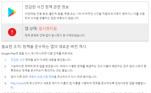 앱 상태는 일시정지됨 이라고 되어있고, 정책 문제로 앱이 일시정지 및 삭제되었습니다. 라고 적혀있다.