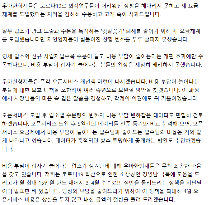 그건 아마 배민에서도 똑같이 생각을 하고 있는건지, 아래 사과문을 보면 "코로나19로 외식업주들이 어려워진 상황을 헤아리지 못하고 새 요금 체계를 도입했다는 지적을 겸허히 수용하고 고개 숙여 사과드립니다" 라고 되어있듯, 요금제에 대한 반성보다는 이 시국을 반영하지 못한 발표에 대한 사과를 하고 있죠.