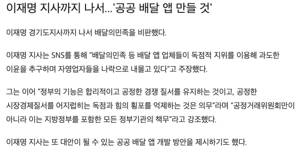 이재명 지사님부터 시작해서 공공 배달앱 만들어야한다고 촉구하고 있습니다.