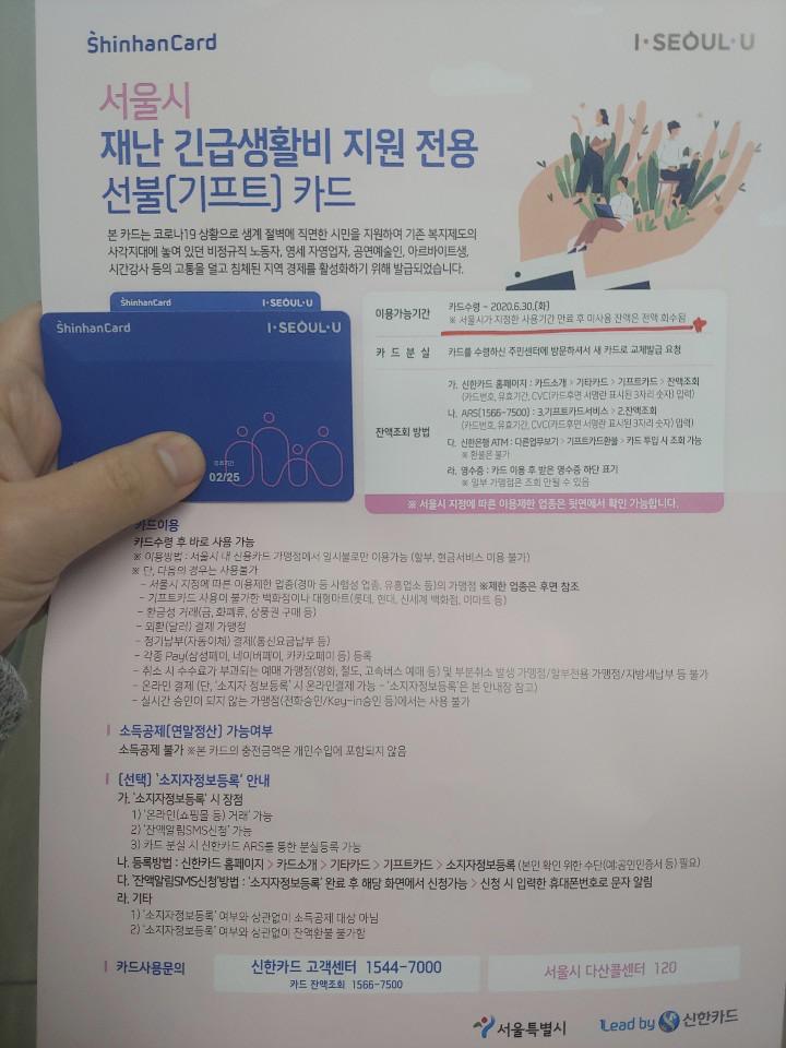 카드는 이렇습니다. 신한카드고 디자인 자체는 심플하게 되어있고, I SEOUL U 로고가 그려져 있네요.