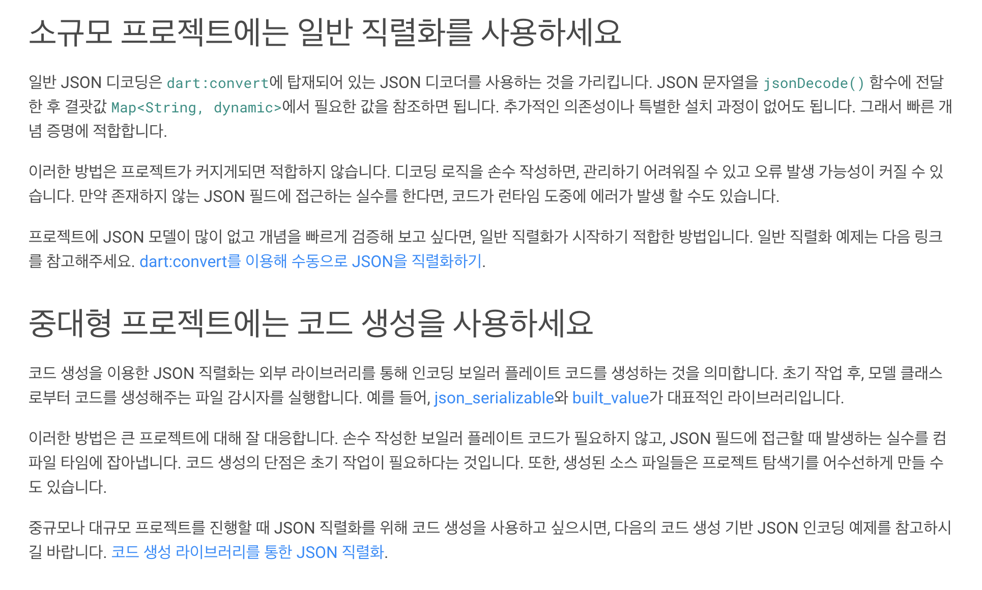 하지만 프로젝트 커지고 협업도 해야되고 세세한 옵션 설정도 해야하면 그냥 코드 생성기(json_annotation) 쓰자