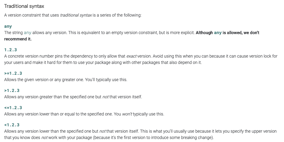 맨 위에 any라는 "모든 버전 허용"이라는 극단적인 옵션도 있긴 한데, 설명에서 나와있듯 플러터 팀에서도 추천하지 않고있다.