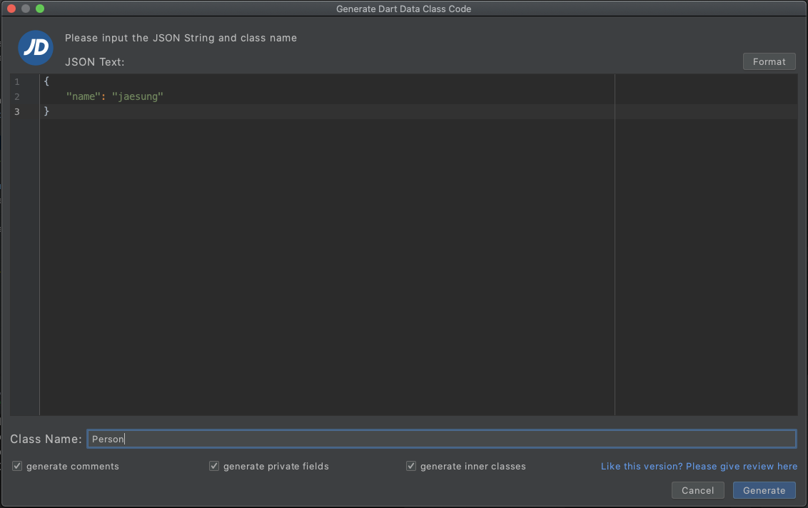 사용법은 json response를 복붙하고 클래스이름 적고 Generate하면 끝