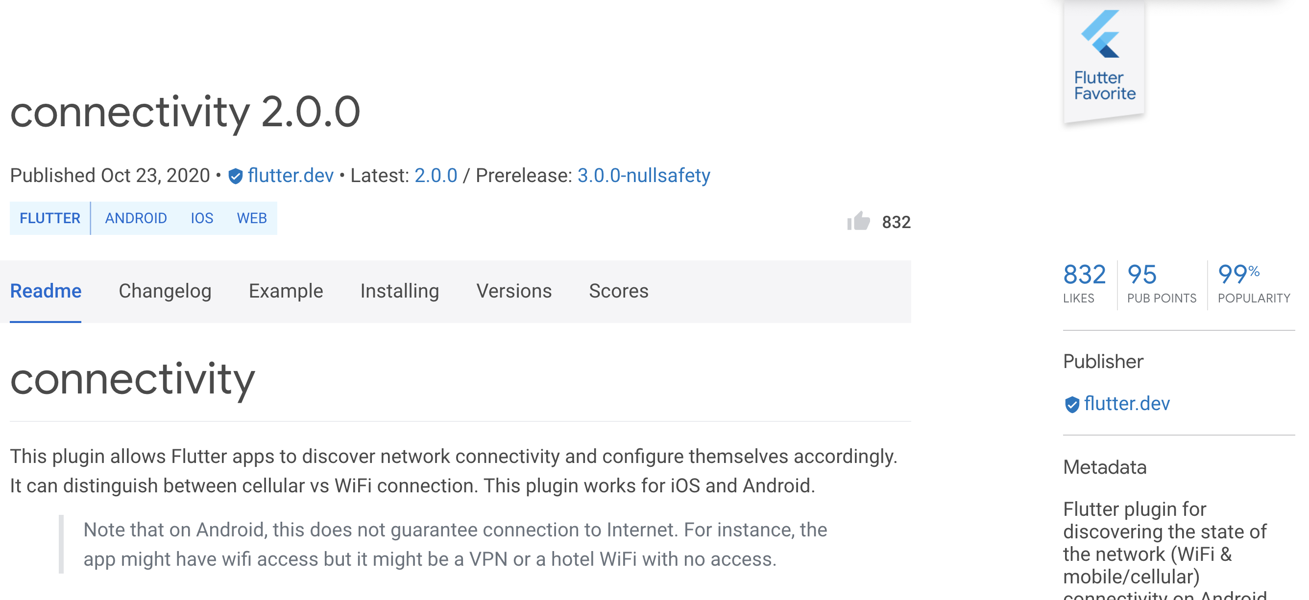 832개의 좋아요, Pub points 95점, 인지도 99%의 패키지며, 플러터 팀에 의해 배포된 패키지입니다.