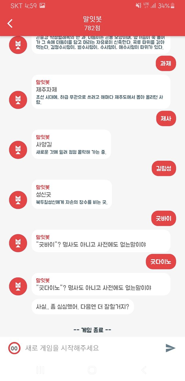 끝말잇봇이 말하는 경우에는 그 단어에 따른 의미도 같이 찾아서 알려주기 때문에 단어를 학습하려고 하시는 경우 연습용으로도 나쁘지 않을 것 같습니다.