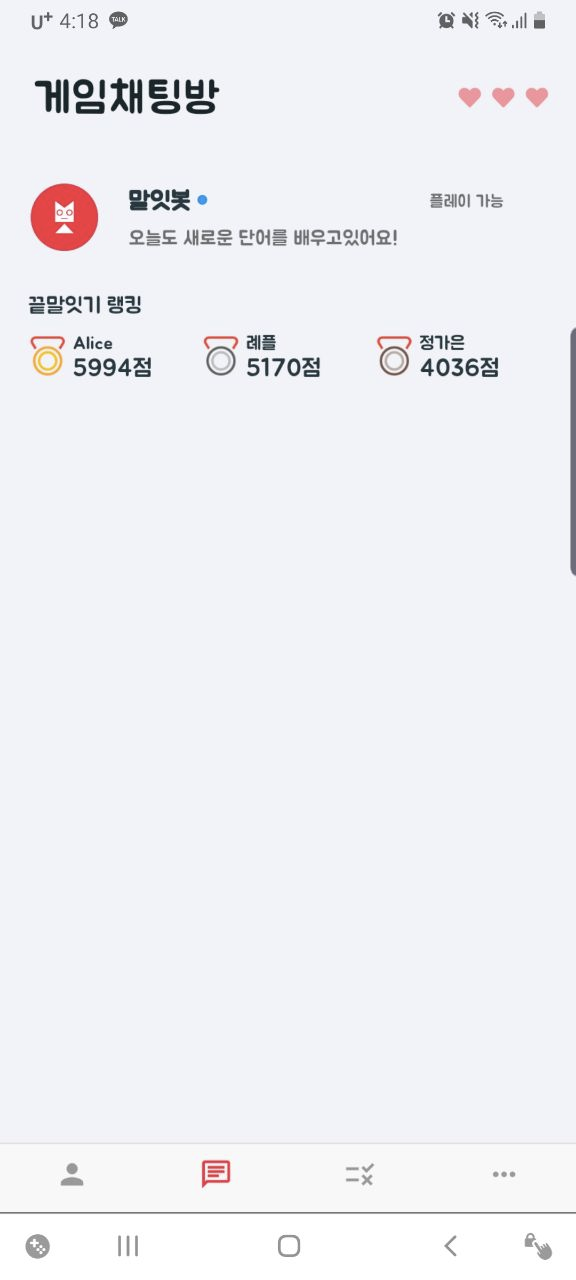 채팅형 앱으로 간단하게 할 수 있고 봇과 티키타카 하면서 많이 주고 받을 수록 점수가 쌓이는 게임이에요!
