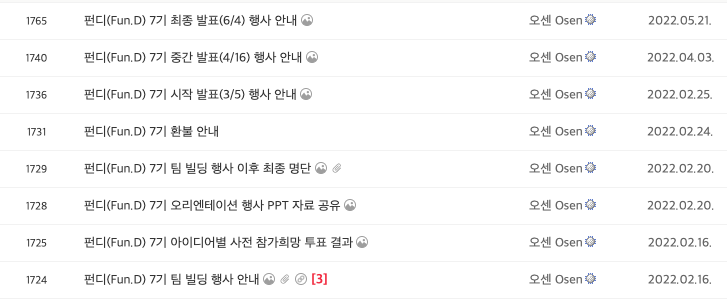 한 팀은 처음부터 스터디 목적으로 모인듯하여 팀빌딩 이후로 소식을 들을 수 없었고.. 나머지 한 팀은 중간발표까지만 발표하시고 최종 발표는 안하셨다.