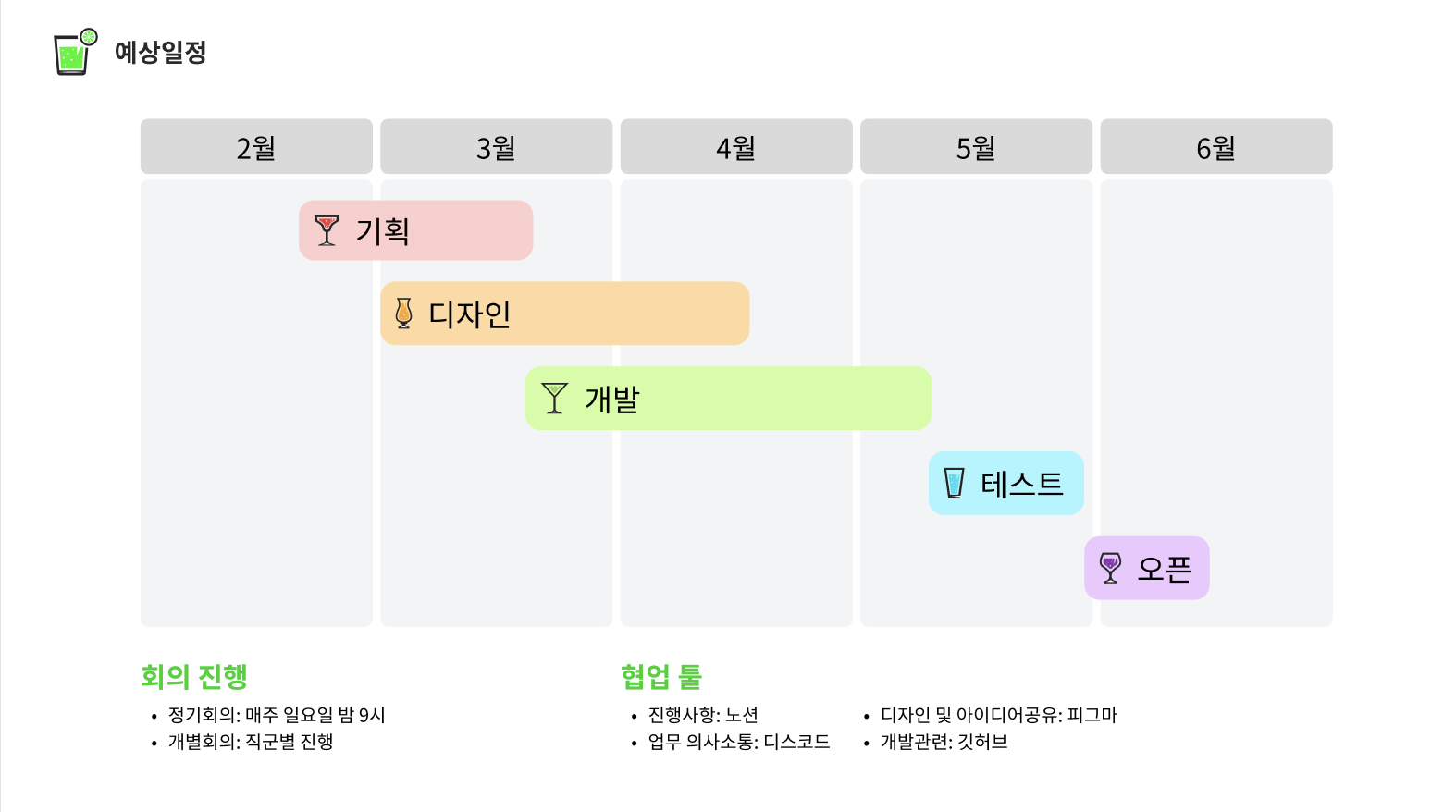 프로젝트 초창기에 PM님의 장소 후원으로 인해 칵테일 파티가 추진된 적이 있다. 각자 칵테일 재료 및 안주를 가져오고, 즉석으로 칵테일 도구를 활용해 칵테일을 만들어 마시면서 놀기 위한 자리였다.