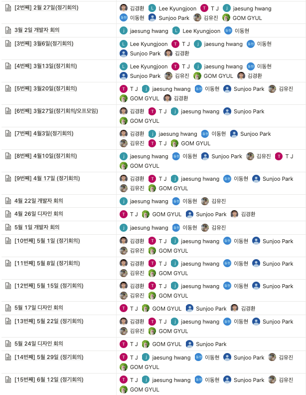 2월 말부터 시작해서 총 21번의 회의. 개발자 회의는 2시간을 훌쩍 넘긴 일도 많았기 때문에 대략적으로 계산해도 회의 시간만 40시간이 넘어간다.