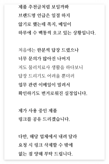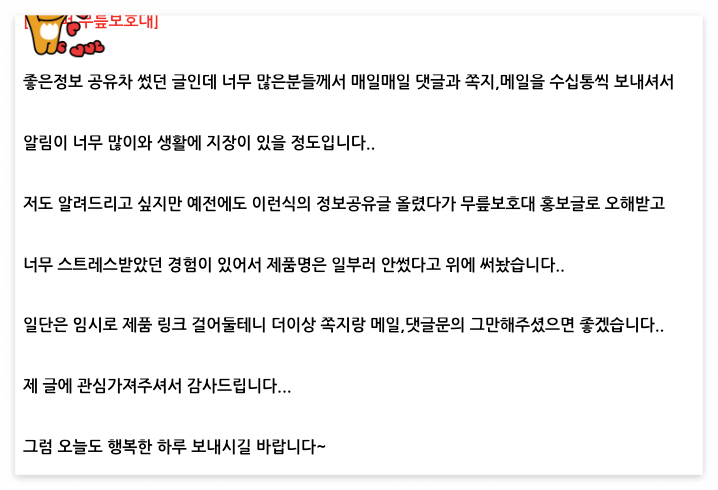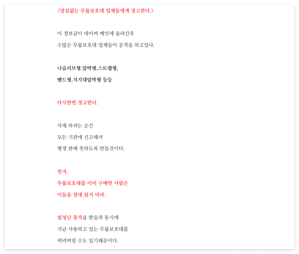문제가 될 수도 있으니 특정 제품명이나 링크는 최대한 제거했습니다만, 이런 글들이 한두개가 아니고 패턴은 다 비슷한지라 이 글을 읽은 분들은 비슷한 글에 현혹되진 않으셨으면 좋겠습니다.