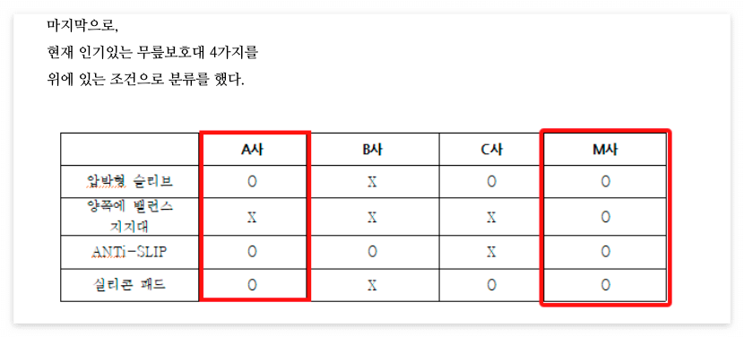 그 다음으로는 무릎보호대의 유형과 앞으로 소개할 제품의 강점(두께, 재질, 지지대 등)을 강조하며 해당 강점들을 다 갖고있는 제품들을 비교분석한것마냥 표를 작성해둡니다.